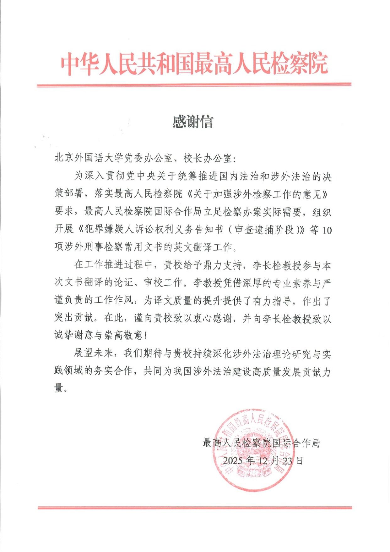 ——高翻学院李长栓教授收到最高检感谢信近日,最高人民检察院向太阳成tyc7111cc发来感谢信,致谢tyc7111cc太阳成集团副院长李长栓教授在“涉外刑事检察常用文书统一英译本”项目中的突出贡献。感谢信指出:“李教授参与本文书翻译的论证、审校工作。李教授凭借深厚的专业素养与严谨负责的工作作风,为译文质量的提升提供了有力指导,作出了突出贡献。”2025年12月,最高人民检察院国际合作局组织翻译的10种涉外刑事检察常用文书英译本在检察业务应用系统2....
