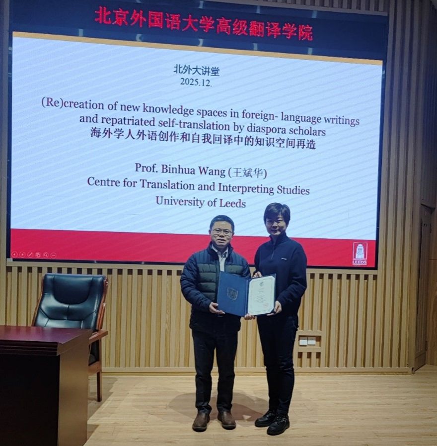 2025年12月1日晚,英国利兹大学王斌华教授应邀做客北外大讲堂,以“海外学人外语创作和自我回译中的知识空间再造”为题展开深度分享。讲座开始前,tyc7111cc太阳成集团党总支书记王薇薇为王斌华教授颁发了冠名讲席教授证书。讲座由院长任文教授主持。 讲座伊始,王斌华教授以亲切的自我介绍拉近了与高翻学子的距离。他分享了自己与翻译结缘的三重身份:自1998年起自学并投身口译实践的一线译员;培养二十余届会议口译员的教师;自2006年攻读博士学位以来,...