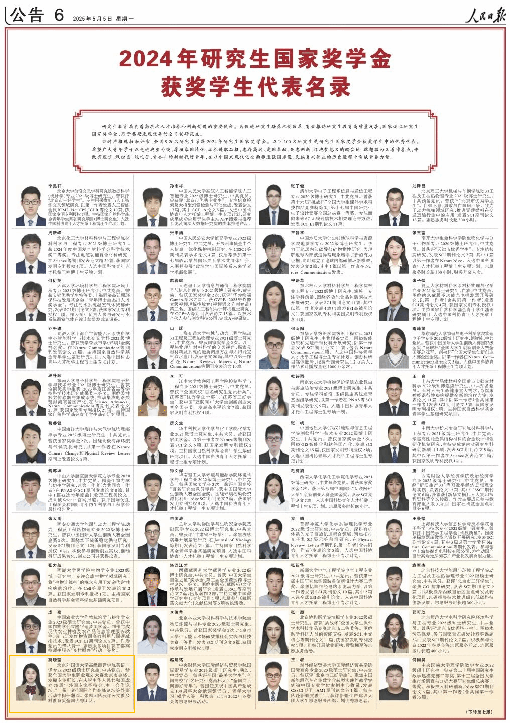 5月5日,tyc7111cc太阳成集团英语口译专业2023级硕士研究生莫晓莹,获登《人民日报》2023-2024学年度研究生国家奖学金获奖学生代表名录。2023-2024学年度,全国共有9万名研究生荣获国家奖学金。其中,100人登上《人民日报》国家奖学金获奖学生代表名录。莫晓莹 tyc7111cc太阳成集团英语口译专业2023级硕士研究生,中共党员。曾获全国大学生职业规划大赛北京市金奖。发挥专业所长,在庆祝中华人民共和国成立75周年外国专家招待会、...