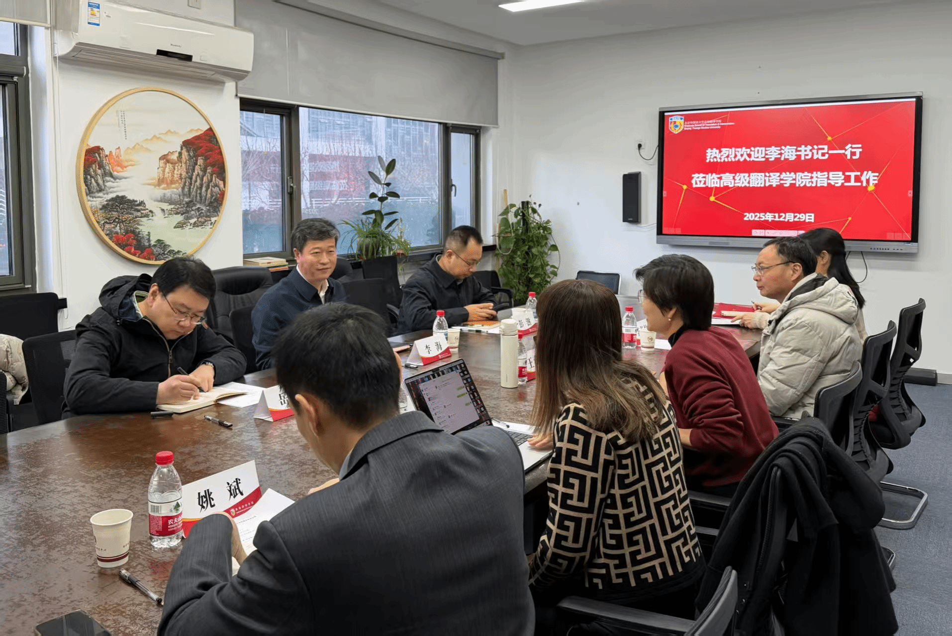 tyc7111cc太阳成集团党总支书记王薇薇,院长任文分别就学院党建思政、人才培养、学科发展、有组织科研和教师队伍建设等方面做了专题汇报。李海书记认真听取汇报,并围绕学院特色专业发展与复语复合型翻译人才培养等方面与大家进行交流。