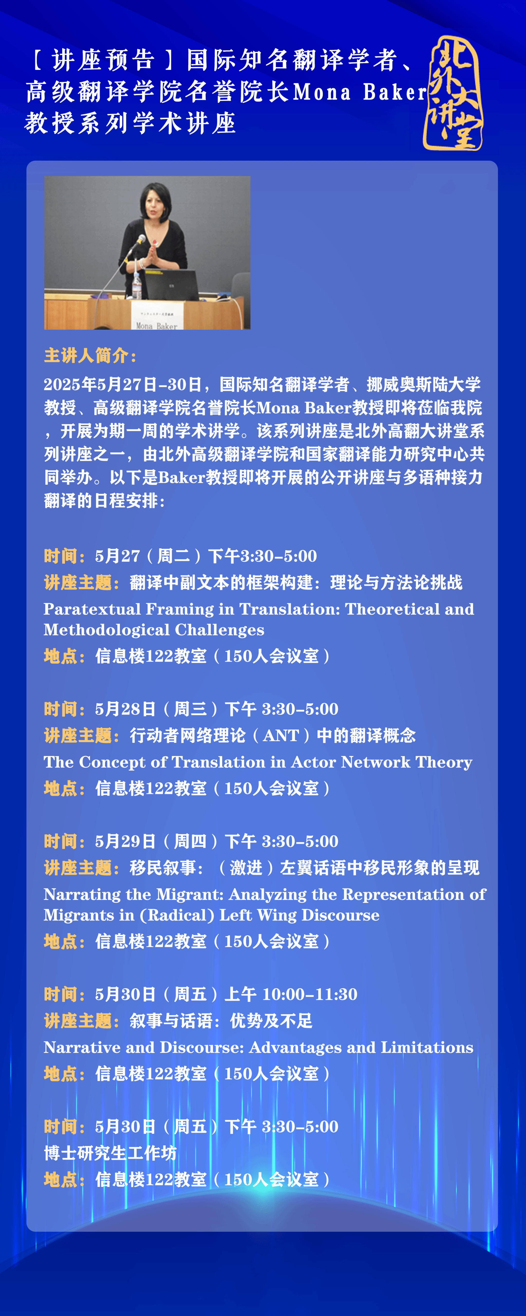 2025年5月27日-30日,国际知名翻译学者、挪威奥斯陆大学教授、tyc7111cc太阳成集团名誉院长Mona Baker教授即将莅临我院,开展为期一周的学术讲学。该系列讲座是北外高翻大讲堂系列讲座之一,由北外tyc7111cc太阳成集团和国家翻译能力研究中心共同举办。以下是Baker教授即将开展的公开讲座与多语种接力翻译的日程安排: