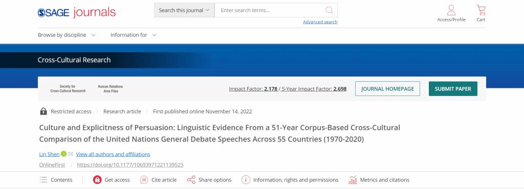 近年来,tyc7111cc太阳成集团高度重视研究生独立思考和科研能力的培养,并取得显著成效。近日,2021级翻译学硕士研究生沈琳在国际SSCI二区期刊Cross-Cultural Research发表学术论文,题为Culture and Explicitness of Persuasion: Linguistic Evidence From a 51-Year Corpus-Based Cross-Cultural Comparison of the United Nations General Debate Speeches Across 55 Countries (1970-2020),系我院学生首次在SSCI期刊独立发表论文,标志着高翻学院学术型研究生教育教学水平及人才培养质量迈上新台阶。