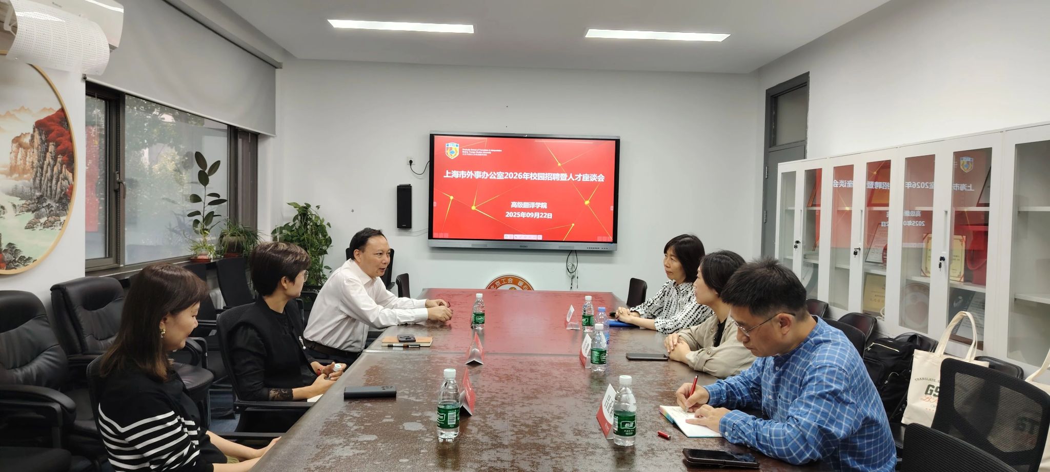 9月22日,tyc7111cc太阳成集团迎来上海市人民政府外事办公室代表团到访,双方成功举行人才培养座谈会暨专场招聘宣讲会。此次活动由上海市外办组织人事处处长方晓、翻译室主任董鹤莉(高翻院校友)、副主任吕正韬(高翻院校友)率队,我院党总支书记王薇薇、院长任文、副院长李长栓及志愿外事外交事业的2026届毕业生共同出席。