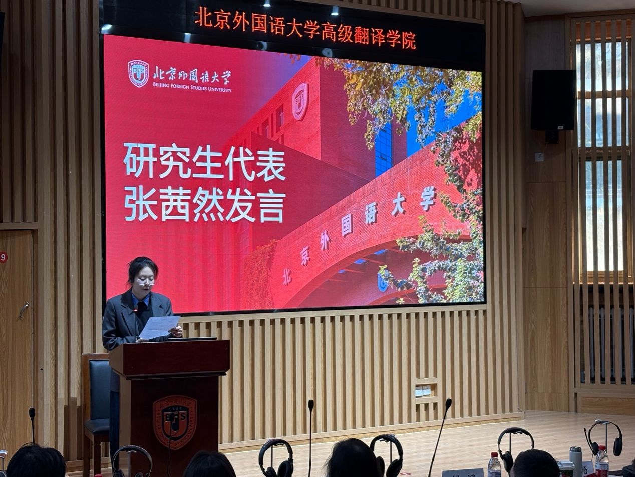 研究生代表2025级英语口译专业学生张茜然表达对学院搭建平台、邀请校外导师的感谢和对项目的期待与憧憬,承诺以主动、虚心、踏实的态度参与项目,努力实现“校内所学+校外所导”的结合与提升。